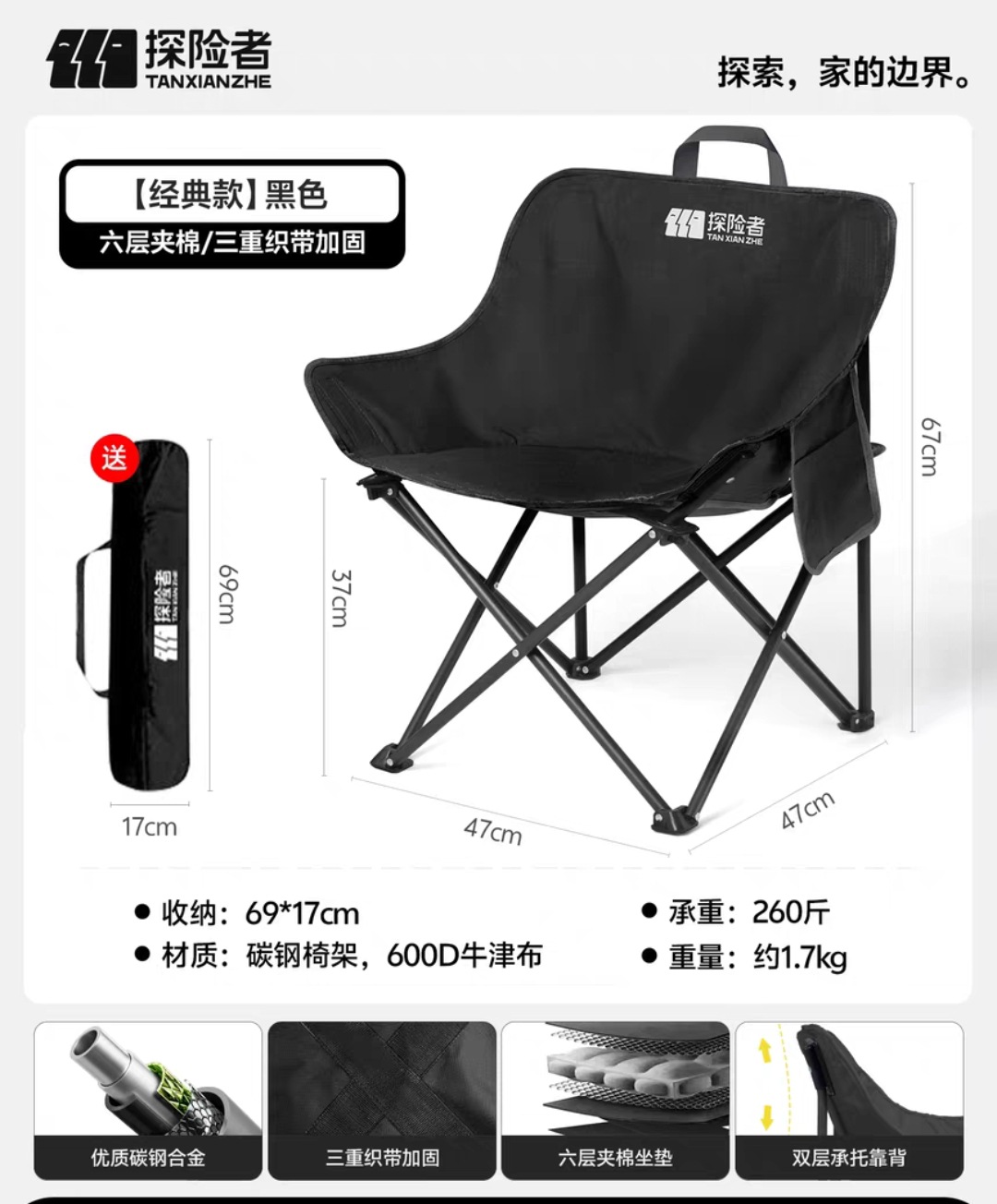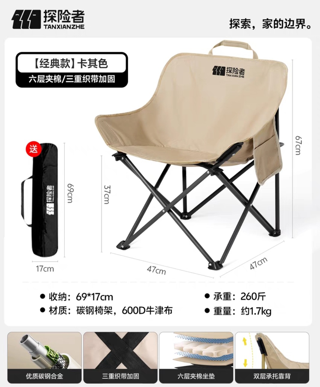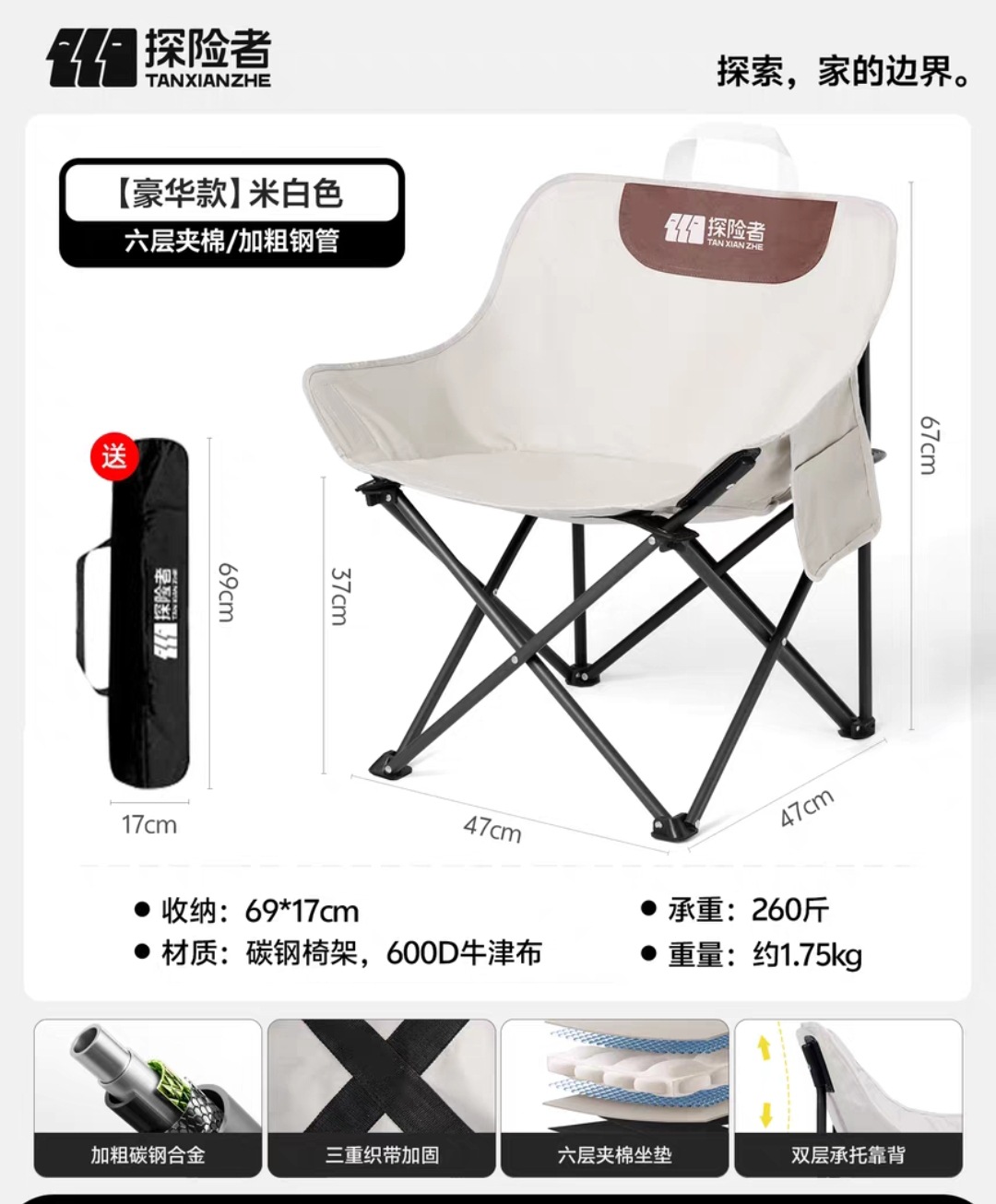 "product_name": "探险者月亮椅露营椅子户外折叠椅便携式躺椅钓鱼凳沙滩椅野餐桌椅",