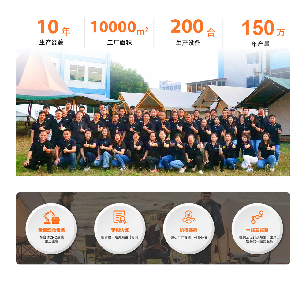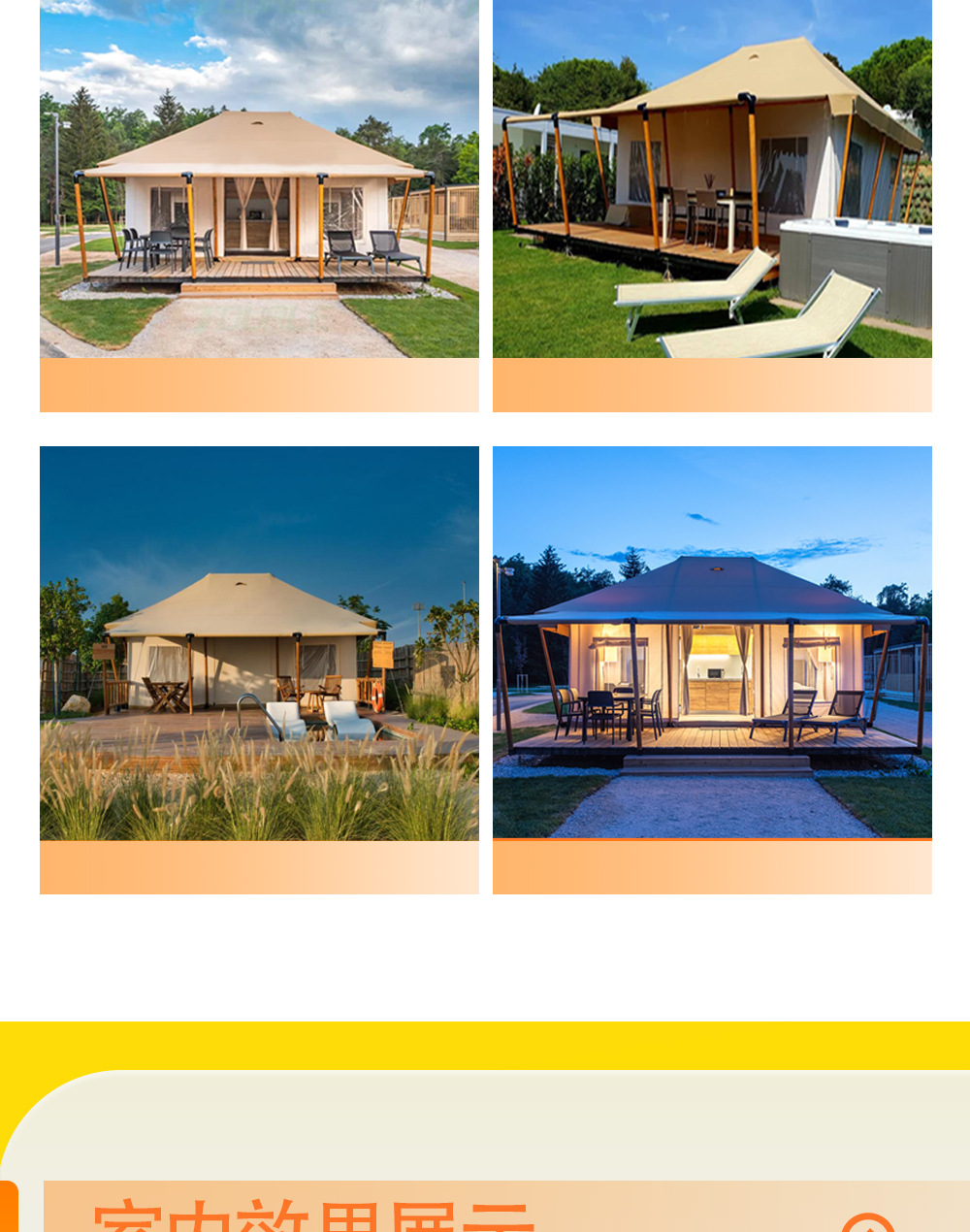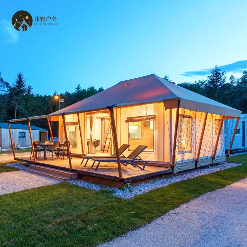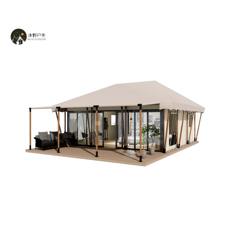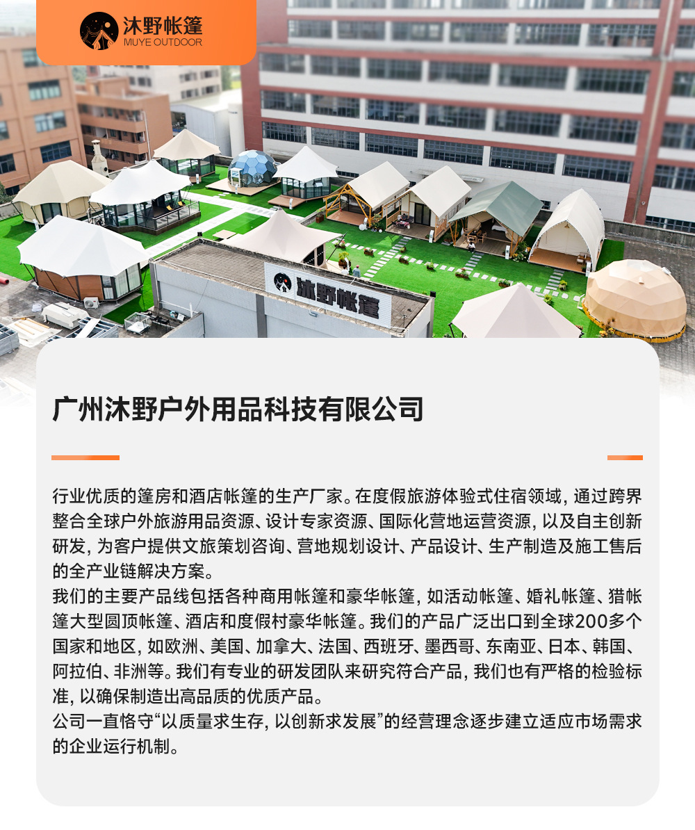 "product_name": "沐野户外钢结构防蚊虫露营帐篷酒店大型景区营地工厂遮阳景区专用",