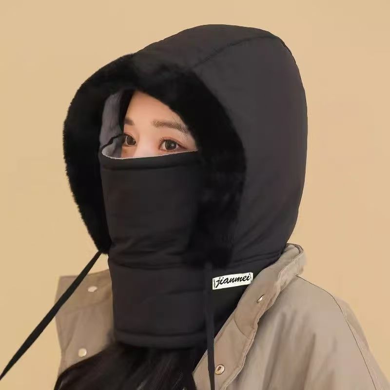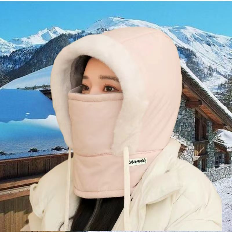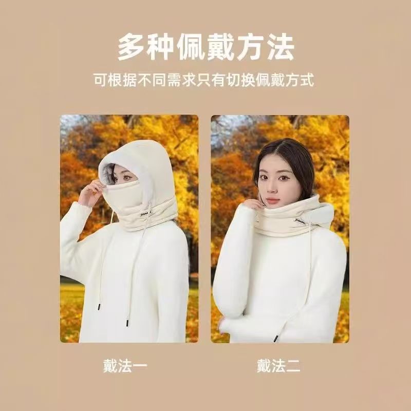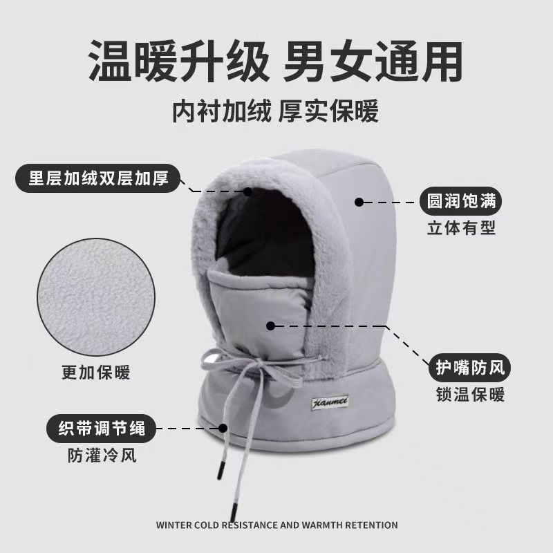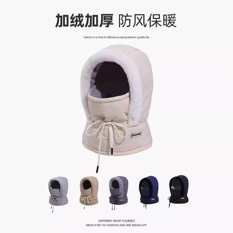 "product_name": "加绒冬季帽子女款保暖头套户外骑车防风防寒面罩围脖一体帽雷锋帽",