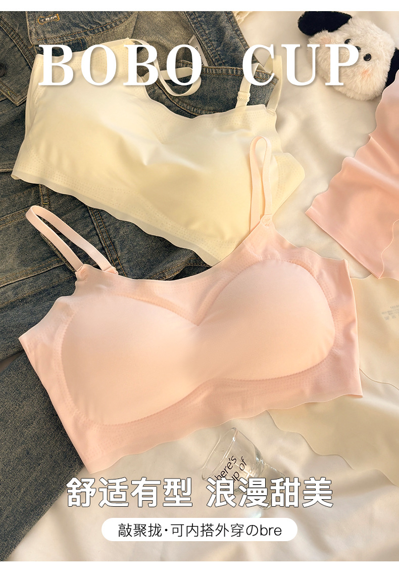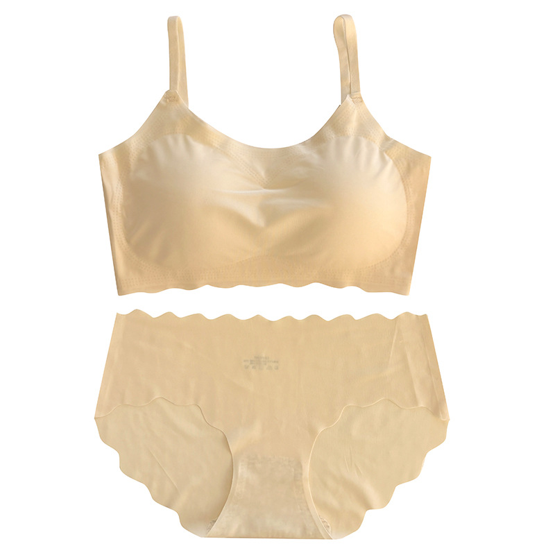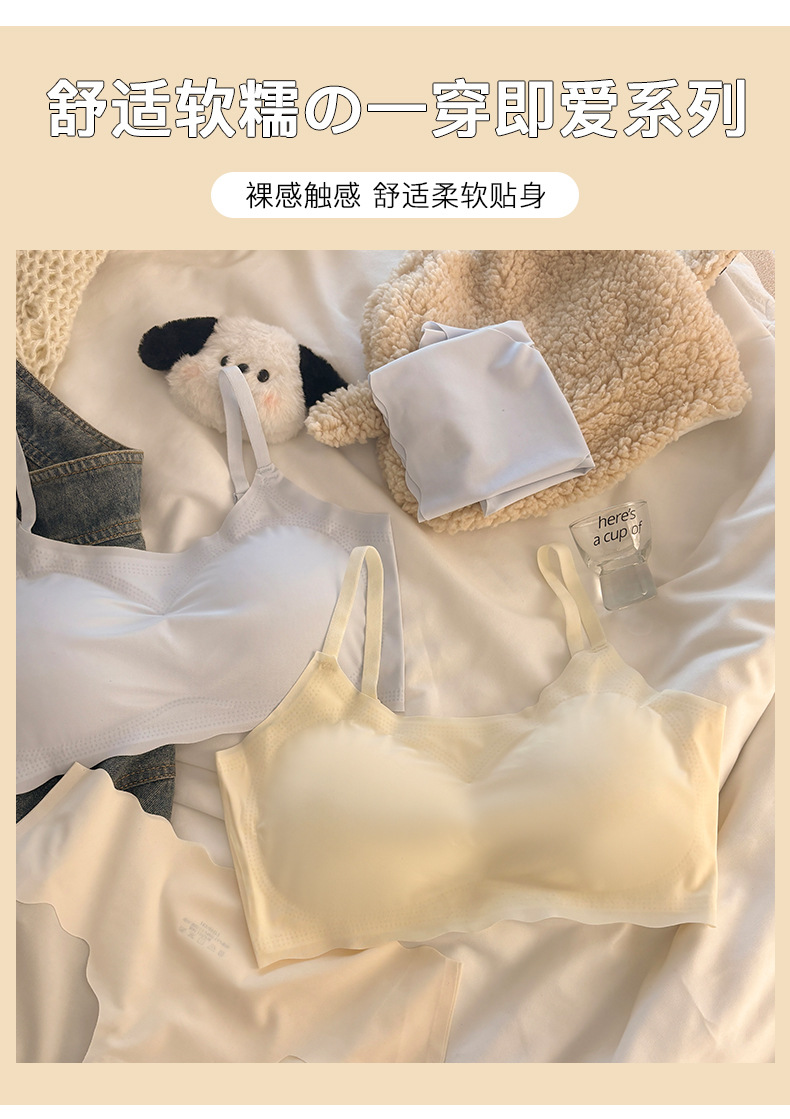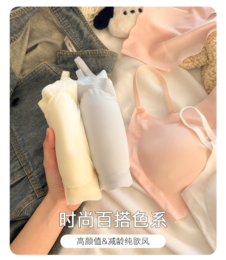"product_name": "浅色无痕内衣内裤套装女运动聚拢无钢圈少女文胸透气显小吊带背心",